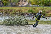 Vor Ort wurde der Baum mit einer Motorsäge zerkleinert und anschließend etwa zehn Meter flussabwärts händisch aus dem Bachbett entfernt, um den Wasserfluss wieder ungehindert zu gewährleisten.