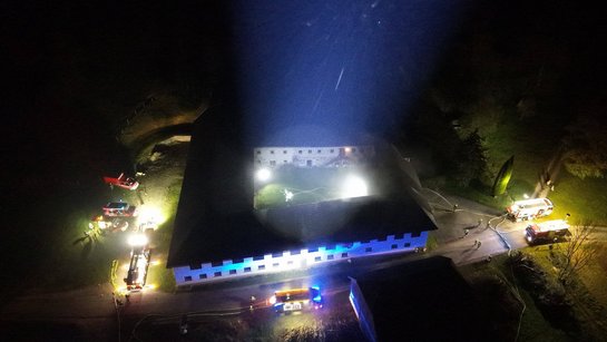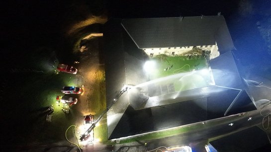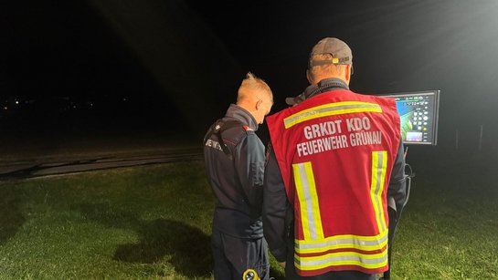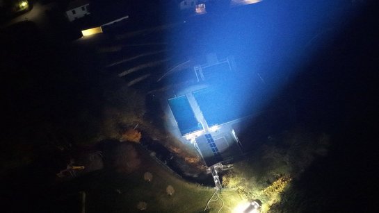 Nachdem die Lageerkundung abgeschlossen wurde, unterstützte die Drohnengruppe mittels Scheinwerfer noch die Ausleuchtung der Wasserentnahmestelle und Zubringerleitung, sowie die Bereitstellung weiterer Bilder zur Entwicklung des Brandes.