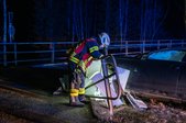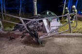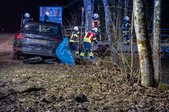 Aus bislang unbekannter Ursache kam ein PKW von der Fahrbahn ab und kollidierte mit mehreren Bäumen sowie einer Brücke. Schließlich kam das Fahrzeug zwischen der Brücke und einem Baum verkeilt zum Stillstand.